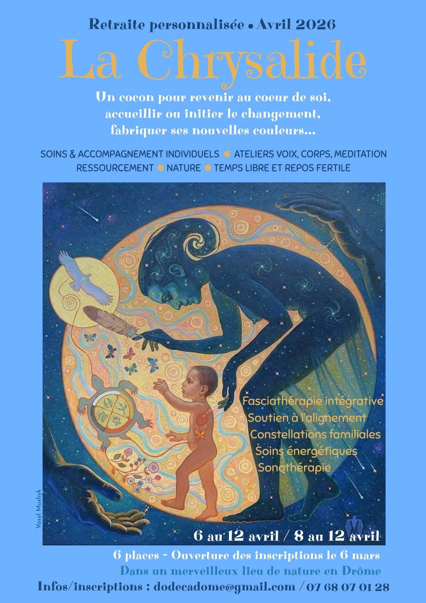 Comme la nymphe dans la chrysalide, c’est vous qui détenez les ressources cachées, le potentiel de transformation, la sagesse intérieure. Nous créons ici le cocon, l’espace fécond et soutenant pour que vous puissiez en trouver l’accès.